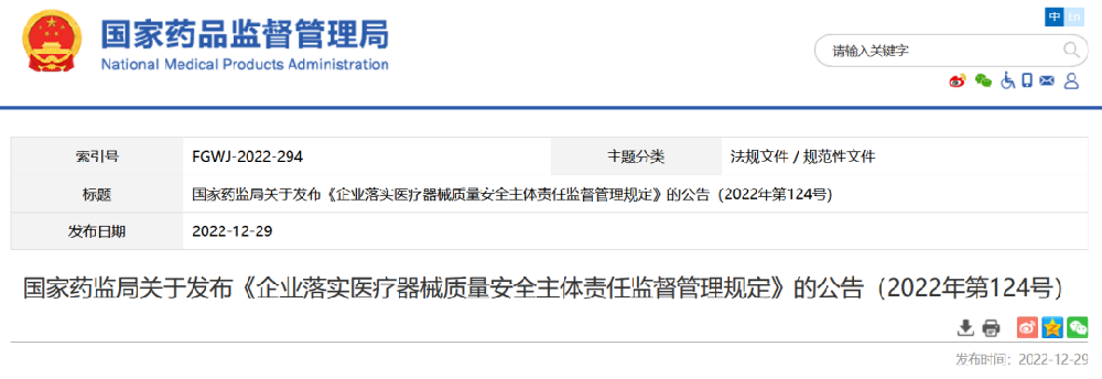 2022年12月29日,國(guó)家藥品監(jiān)督管理局發(fā)布《企業(yè)落實(shí)醫(yī)療器械質(zhì)量安全主體責(zé)任...